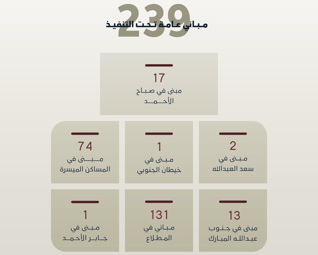 وأشار إلى أن المؤسسة تتابع تنفيذ 239 مبنى عاماً موزعة على المشروعات السكنية، من بينها 17 مبنى في صباح الأحمد، و 74 مبنى في مشروع المساكن الميسرة، ومبنى واحد في خيطان الجنوبي، واثنين في سعد العبدالله، ومبنى واحد في جابر الأحمد، إضافة إلى 131 مبنى في مدينة المطلاع و 13 مبنى في جنوب عبدالله المبارك.